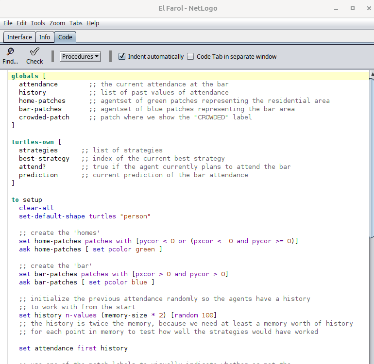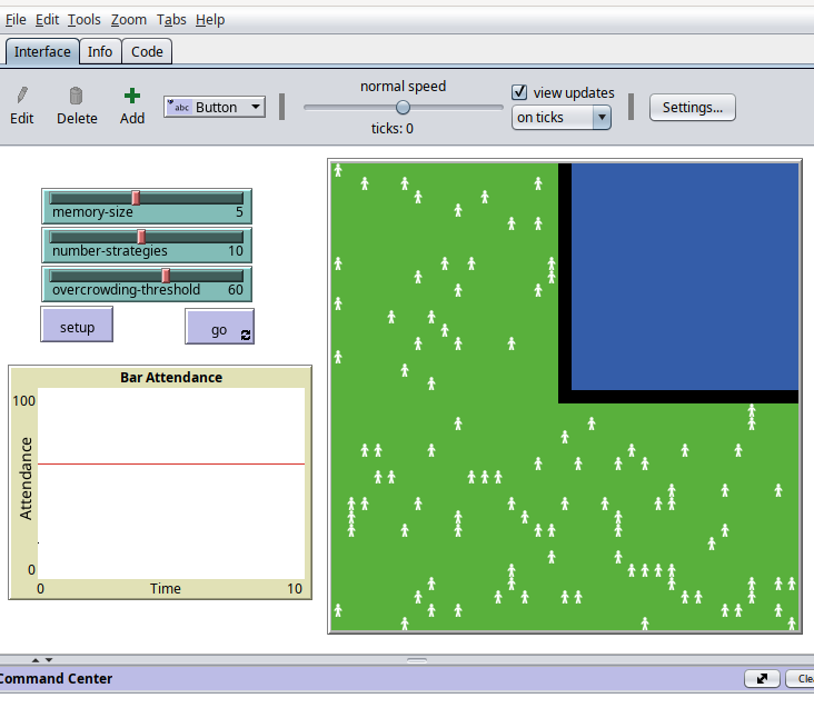 This is what the El Farol Bar Problem looks like in a popular ABMS platform the next post will talk much more about.