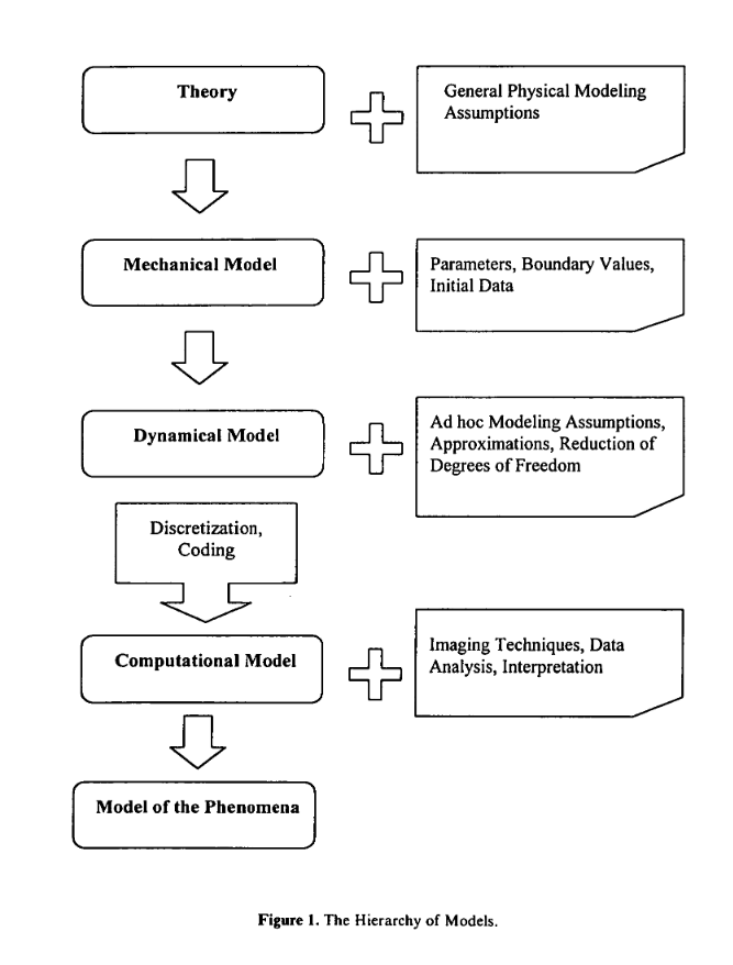 In a 1999 paper, Winsberg illustrates this with a “hierarchy of models” that are traversed in the implementation of physical theories as computer simulations. First, the theory is applied to real world systems as a “mechanical model” — bare bones characterization of the system that allows us to identify the relevant family of equations corresponding to it. “When we characterize a system as being like a damped, harmonic oscillator, we have assigned a mechanical model to the system. ”
